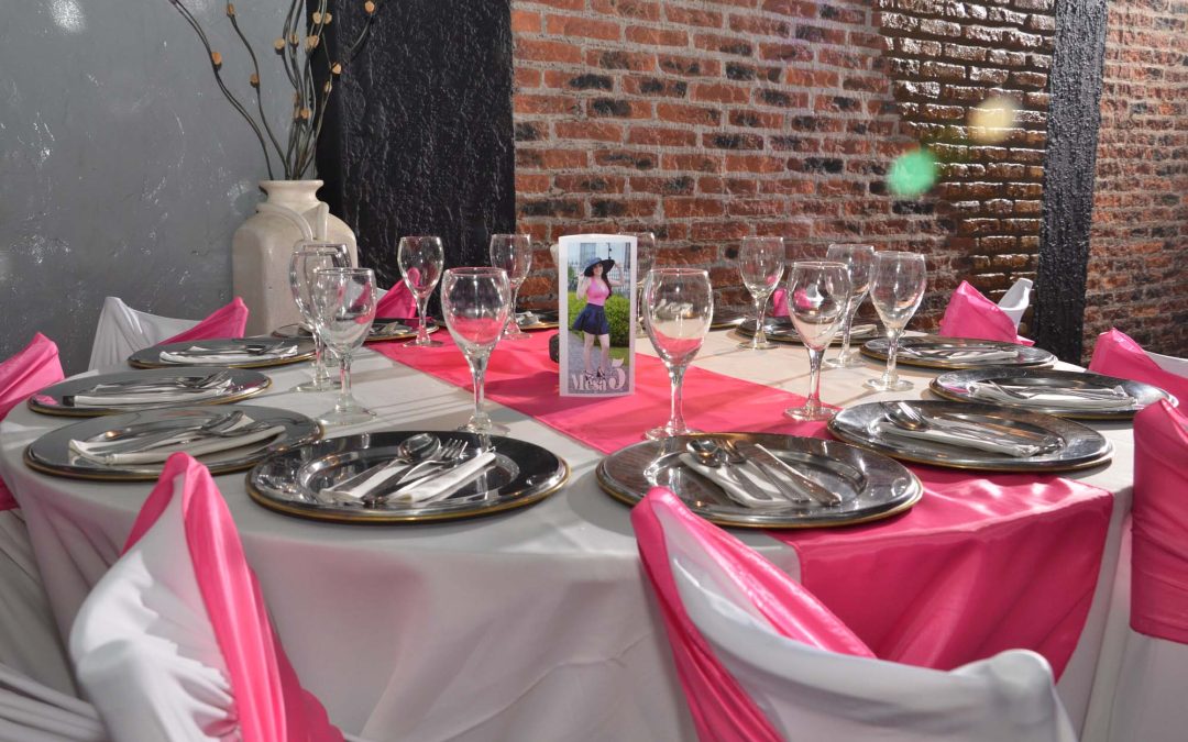 Mesa con Mantelería en Blanco y Rosa para Fiesta de 15 años